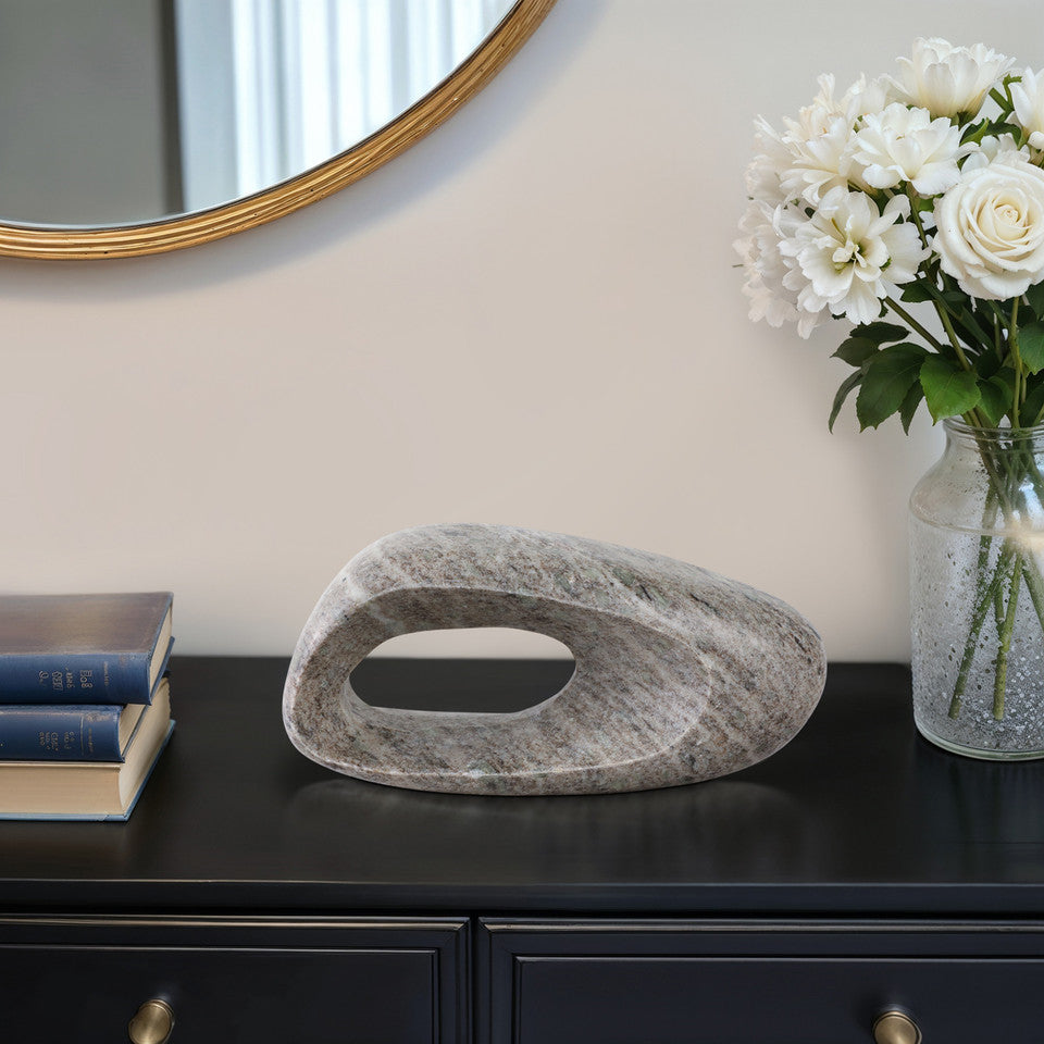 The Jenay Tan Small Marble Statuary adds an organic, sculptural elegance to any setting. Crafted from natural marble with warm tan veining, its smooth, curved shape and open center bring a sense of balance and sophistication to consoles, shelves, or tabletops.