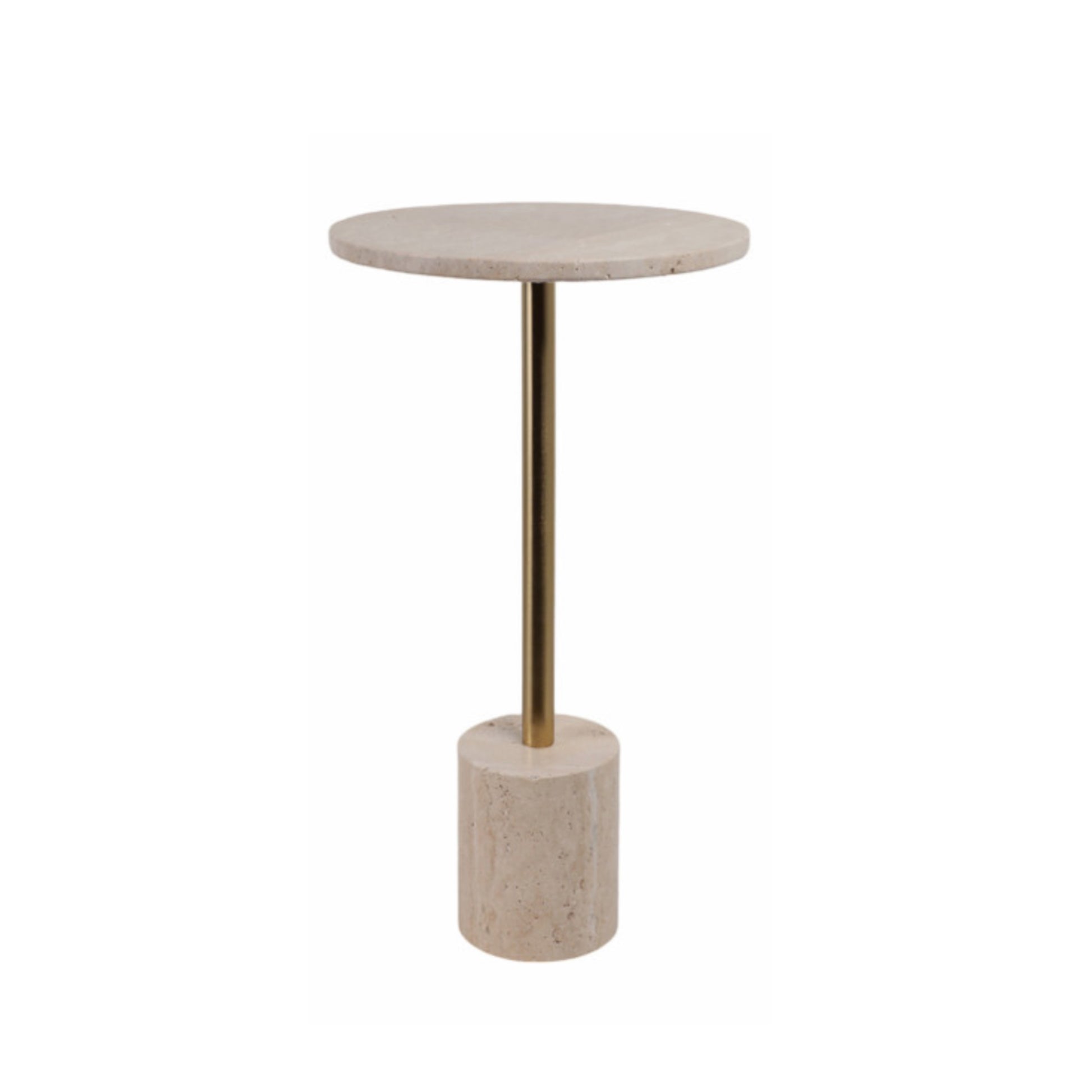 Elegant travertine and brass accent table with timeless, sculptural design. Each piece features natural stone variations for a one-of-a-kind look.