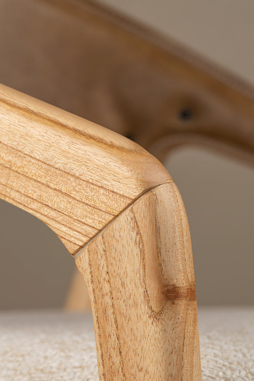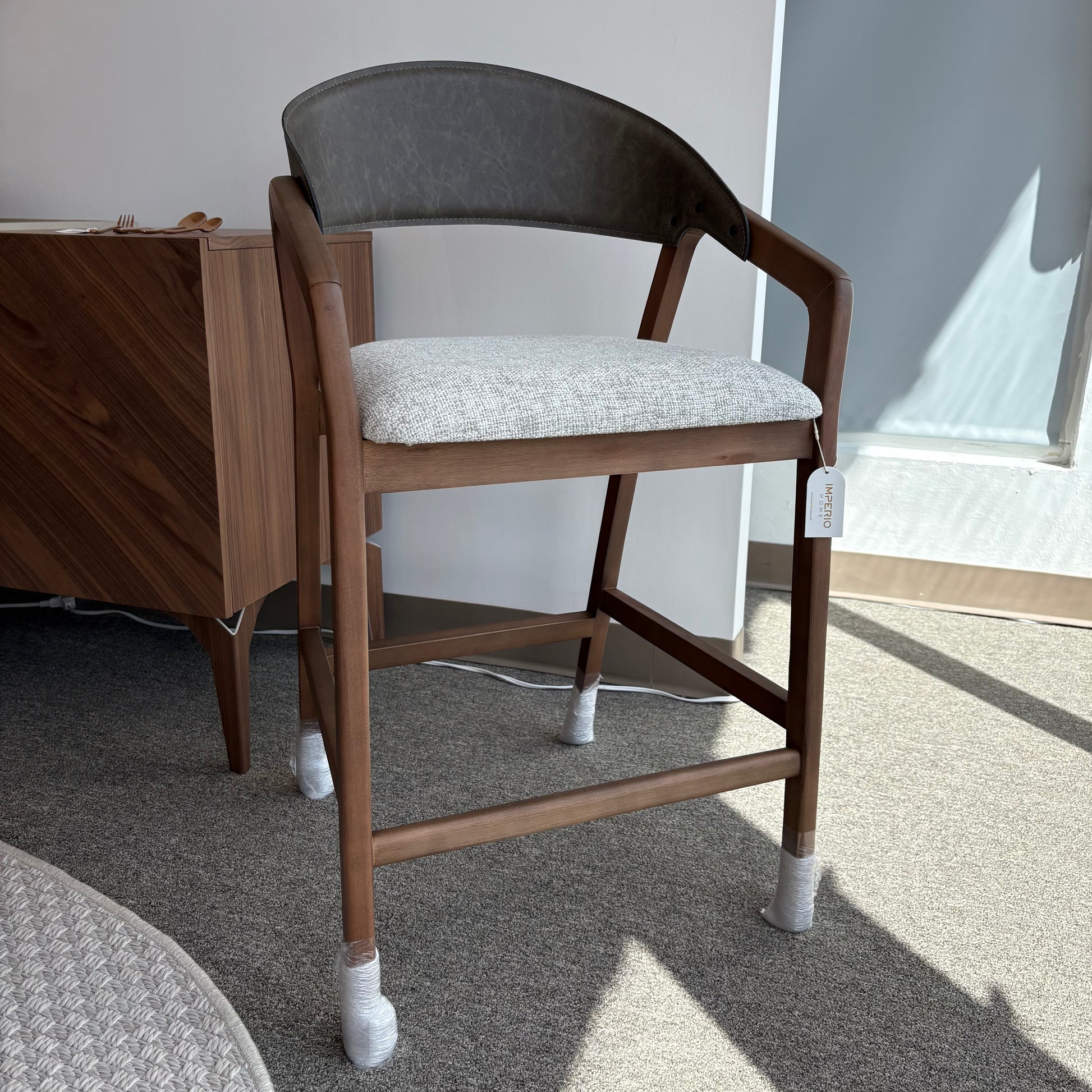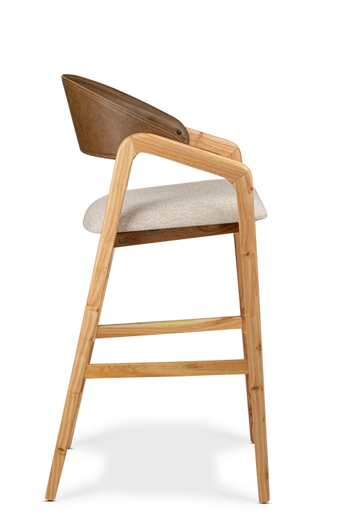 The Plena Barstool Set combines the warmth of natural wood with the sophistication of leather and soft fabric upholstery. Its curved design and supportive backrest provide both comfort and timeless style ideal for kitchen islands, bars, or dining counters.