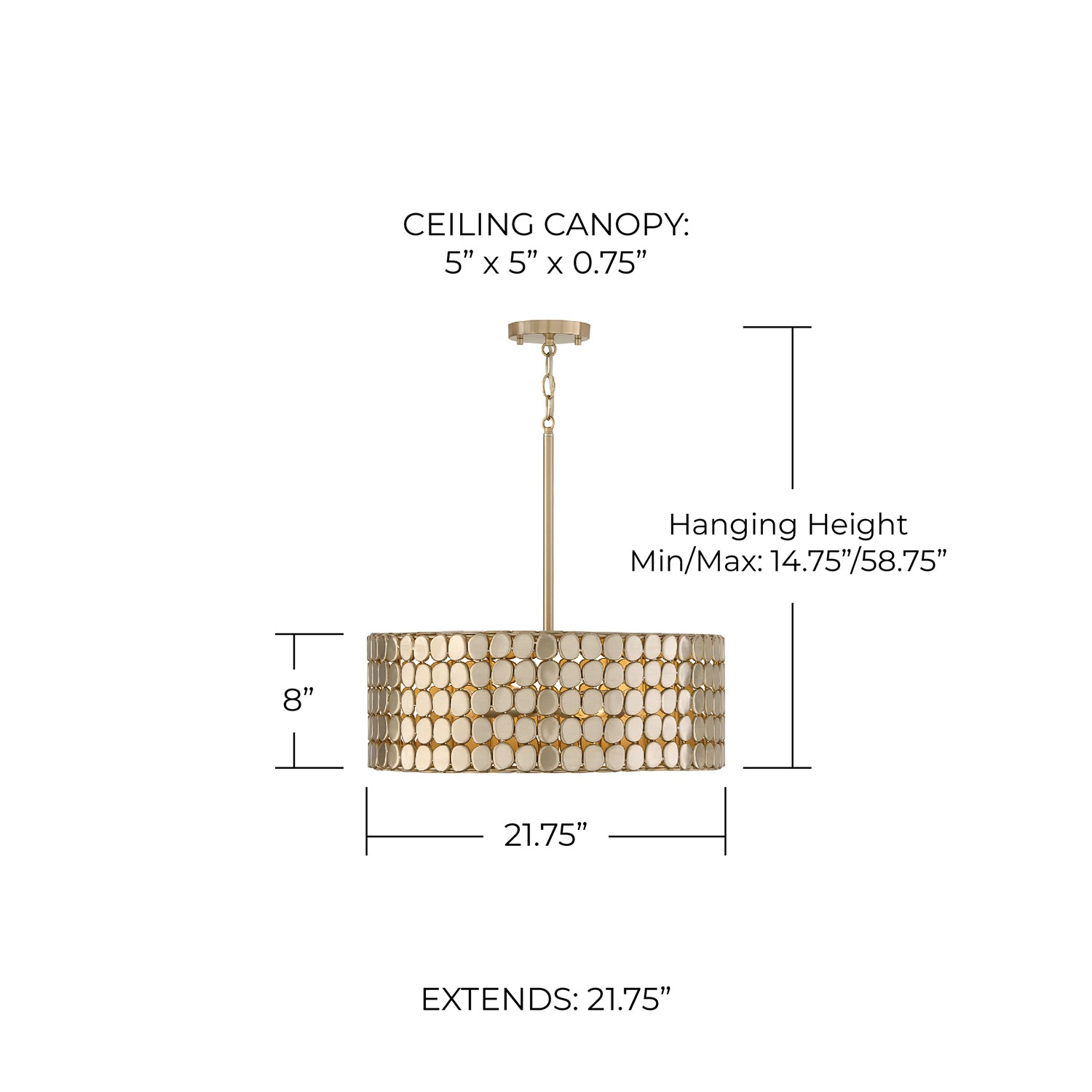 Invite captivating shimmer to any space with the Eliana Medium Pendant. Crafted in a classic drum silhouette, the unique medallions alternate catching the light while teasing glimpses of illumination from within. The refined Champagne Brass finish creates elegant, dimensional shine from every angle.