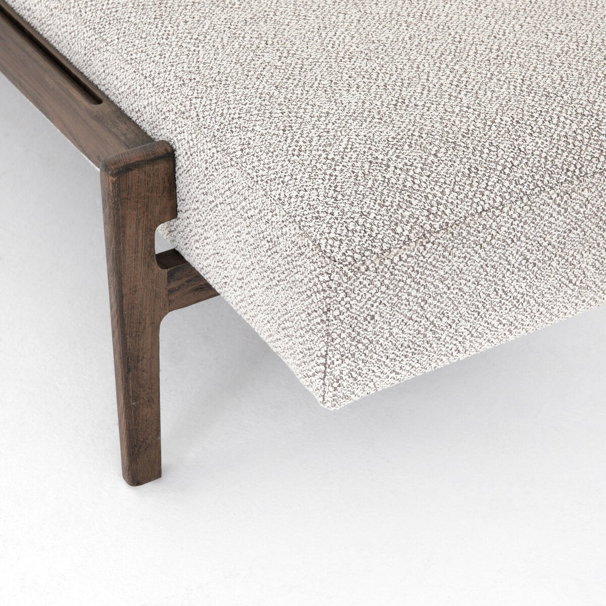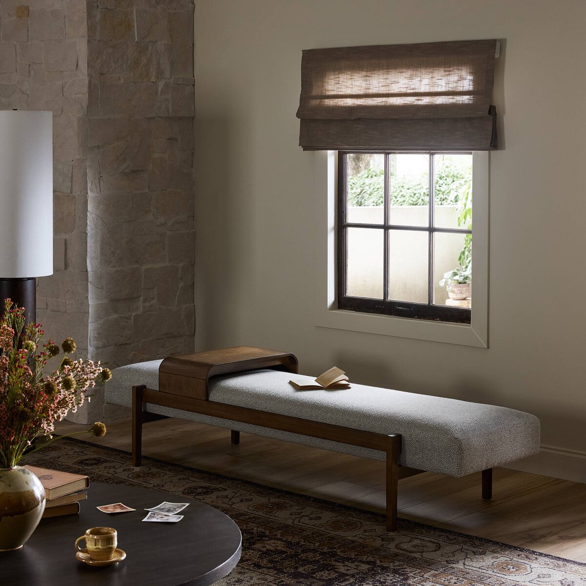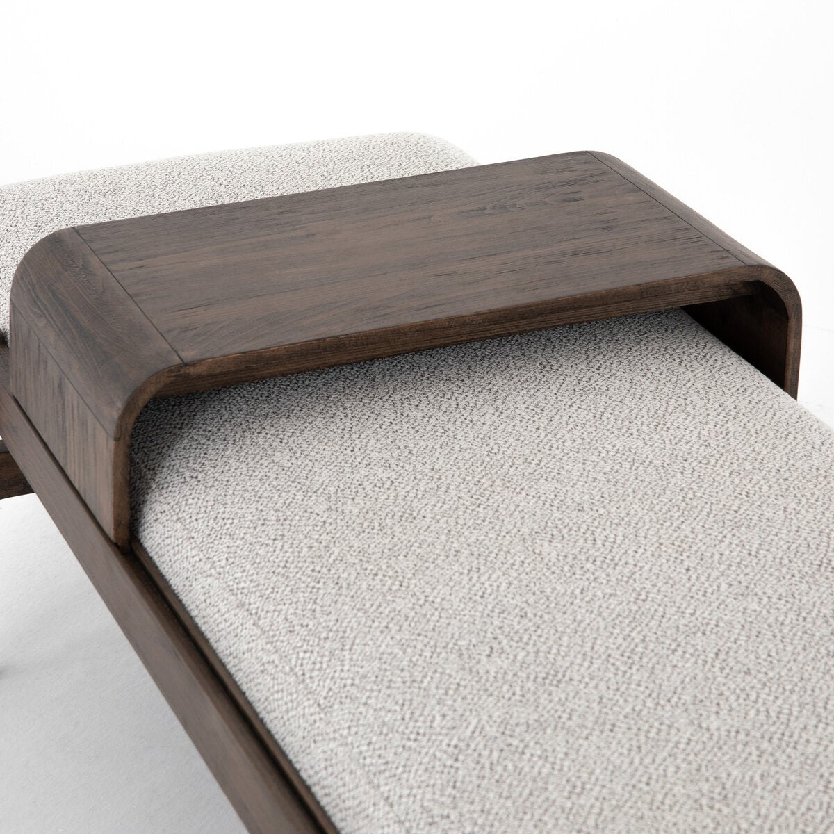 Modern bench with textured upholstery and a solid beech wood sliding tray. Perfect for entryways, living rooms, or bedrooms.