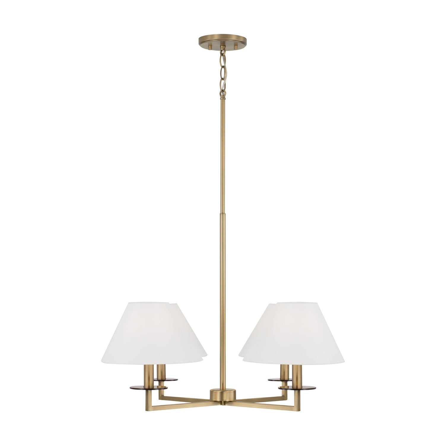 Decadence is in the details. The Gilda Small Chandelier exudes timeless glamour with interchangeable tortoise shell or clear acrylic bobeches for customizable sophistication. The Aged Brass finish brings a warm, luxurious glow, while the tapered White fabric shades and sleek squared arms deliver a crisp, classic aesthetic perfect for modern or transitional interiors.