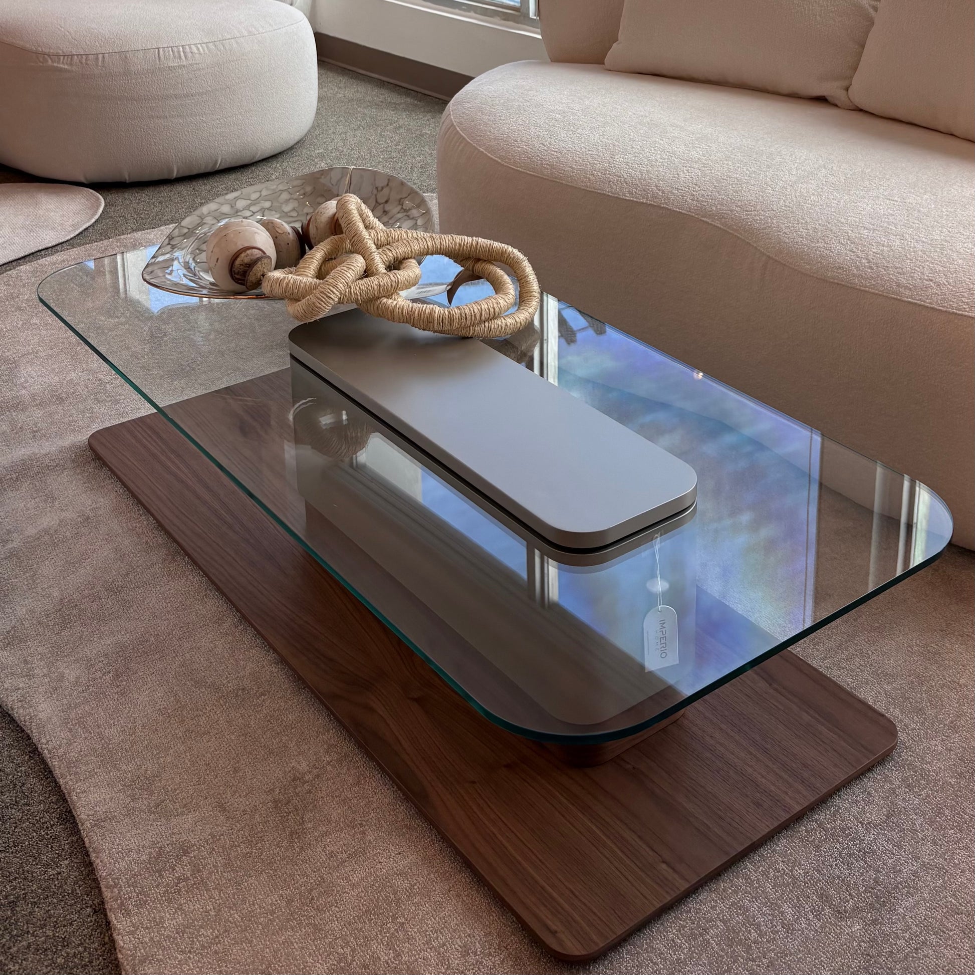 The Moris Coffee Table combines elegance and functionality with its minimalist design. Featuring a clear glass top that highlights its sleek wooden base, this table adds a refined touch to any modern living room.