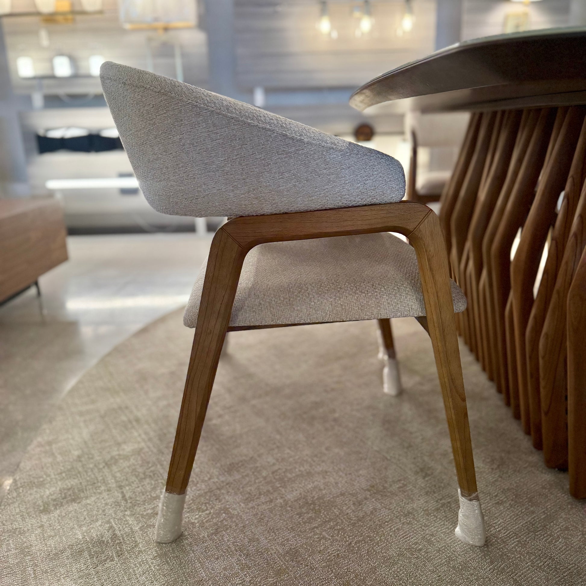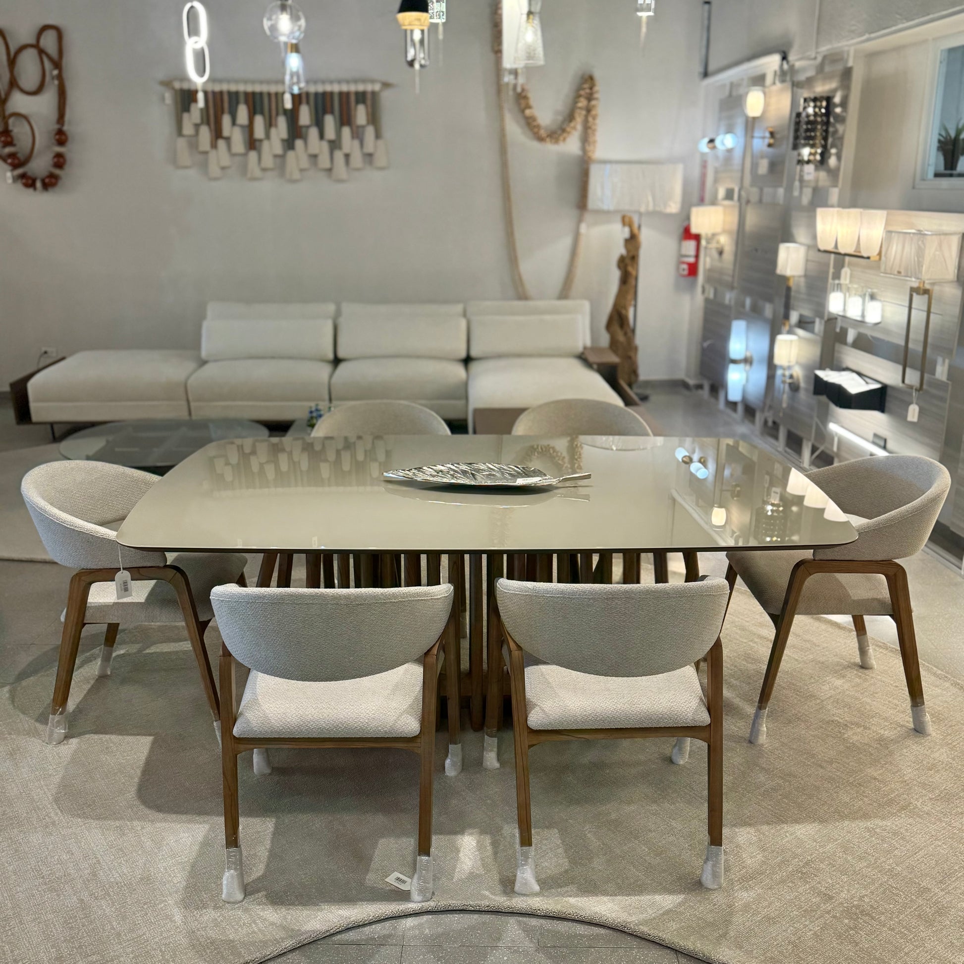 The Videiras Rectangular Dining Table & 6 Alegra Chairs Set combines modern elegance with natural charm. The table features a sculptural solid wood base that adds warmth and sophistication, paired with a tempered glass top for a sleek, luminous look. The Alegra chairs, upholstered in soft beige fabric with natural wood frames, provide both comfort and refined style, making this set a stunning centerpiece for any dining space.