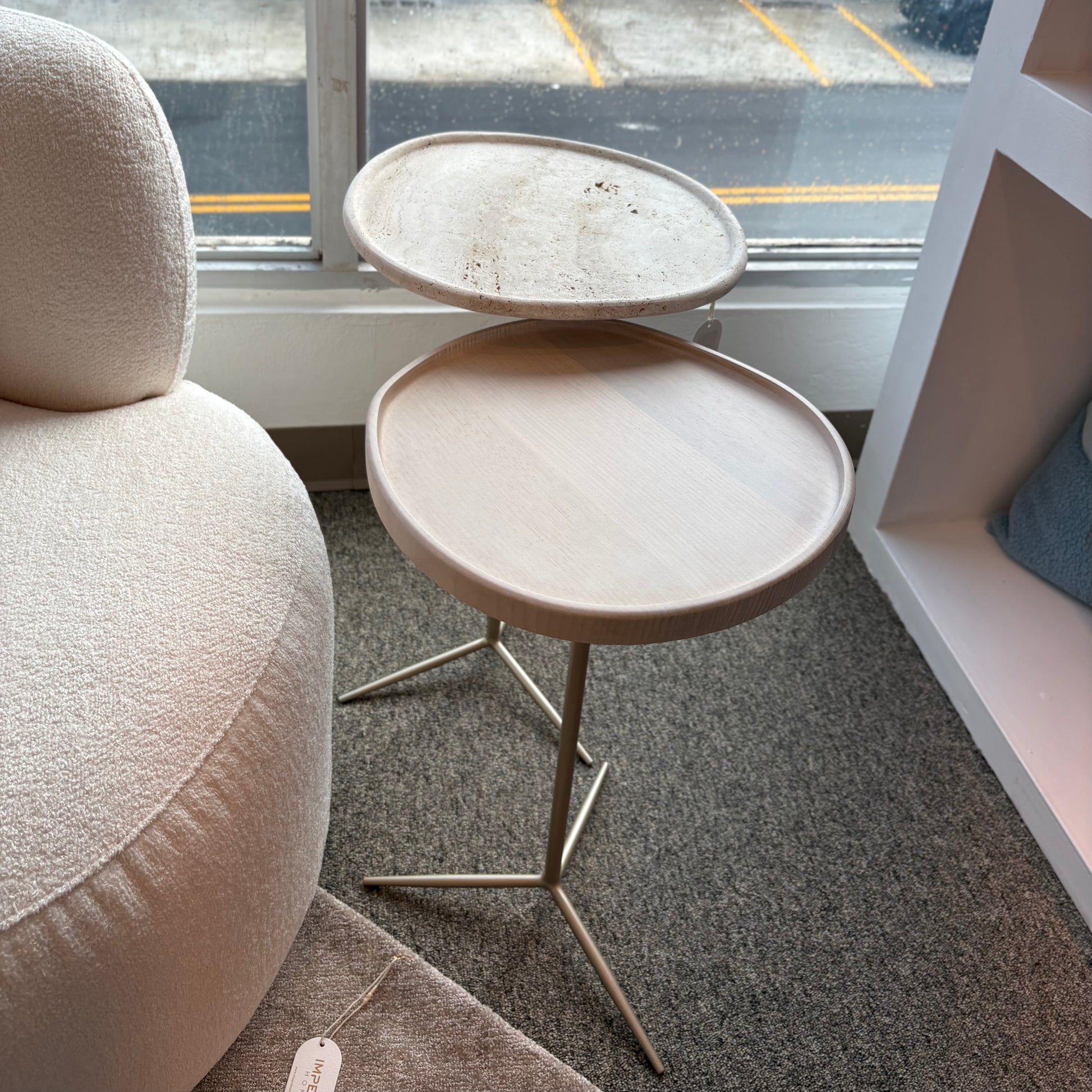 The Tango Side Table Set features a minimalist and elegant design that combines natural wood tops with sleek metal legs. Perfect as an accent piece for living rooms or bedrooms, it adds warmth and sophistication to any space.