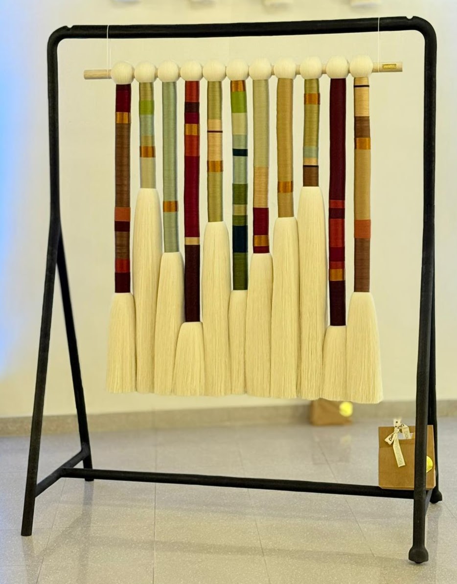 The Samburú Río Wall Hanging (11 Strings) is handcrafted from cotton yarn, woven with colored threads in customizable tones. Mounted on a wooden support for easy installation, it showcases artisanal craftsmanship and organic symmetry.
