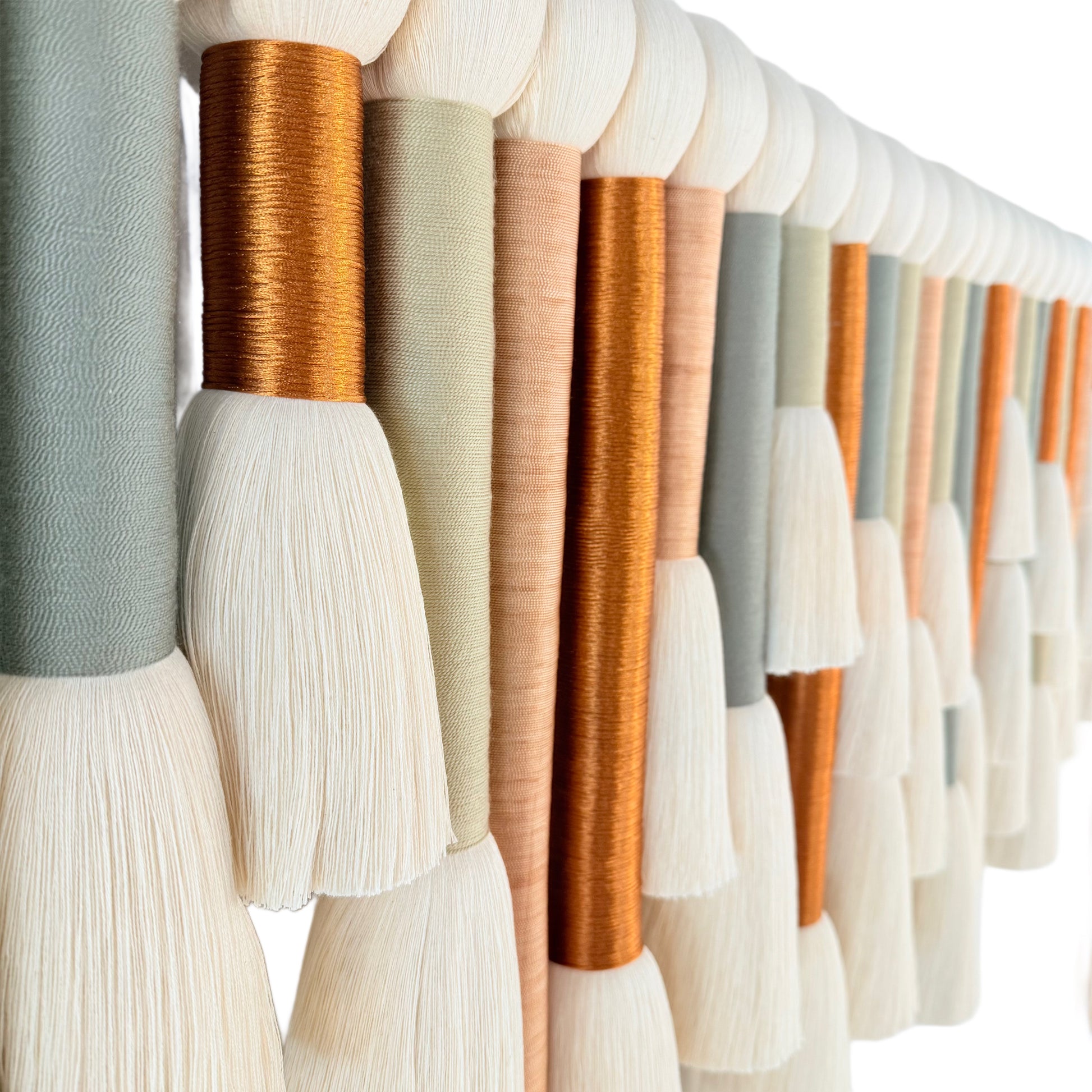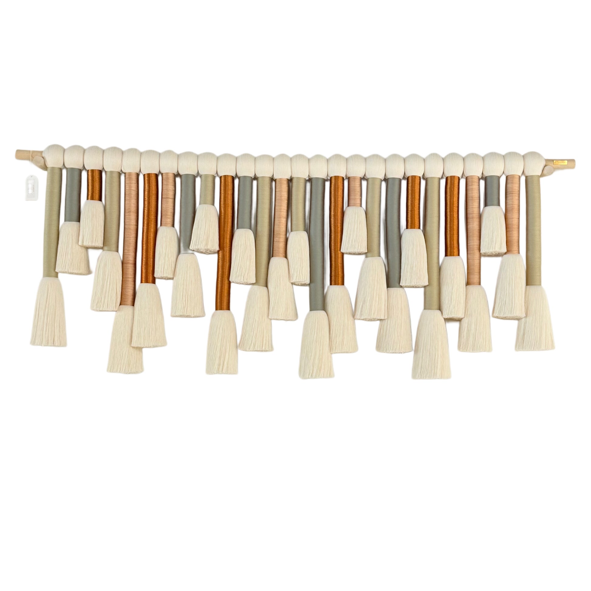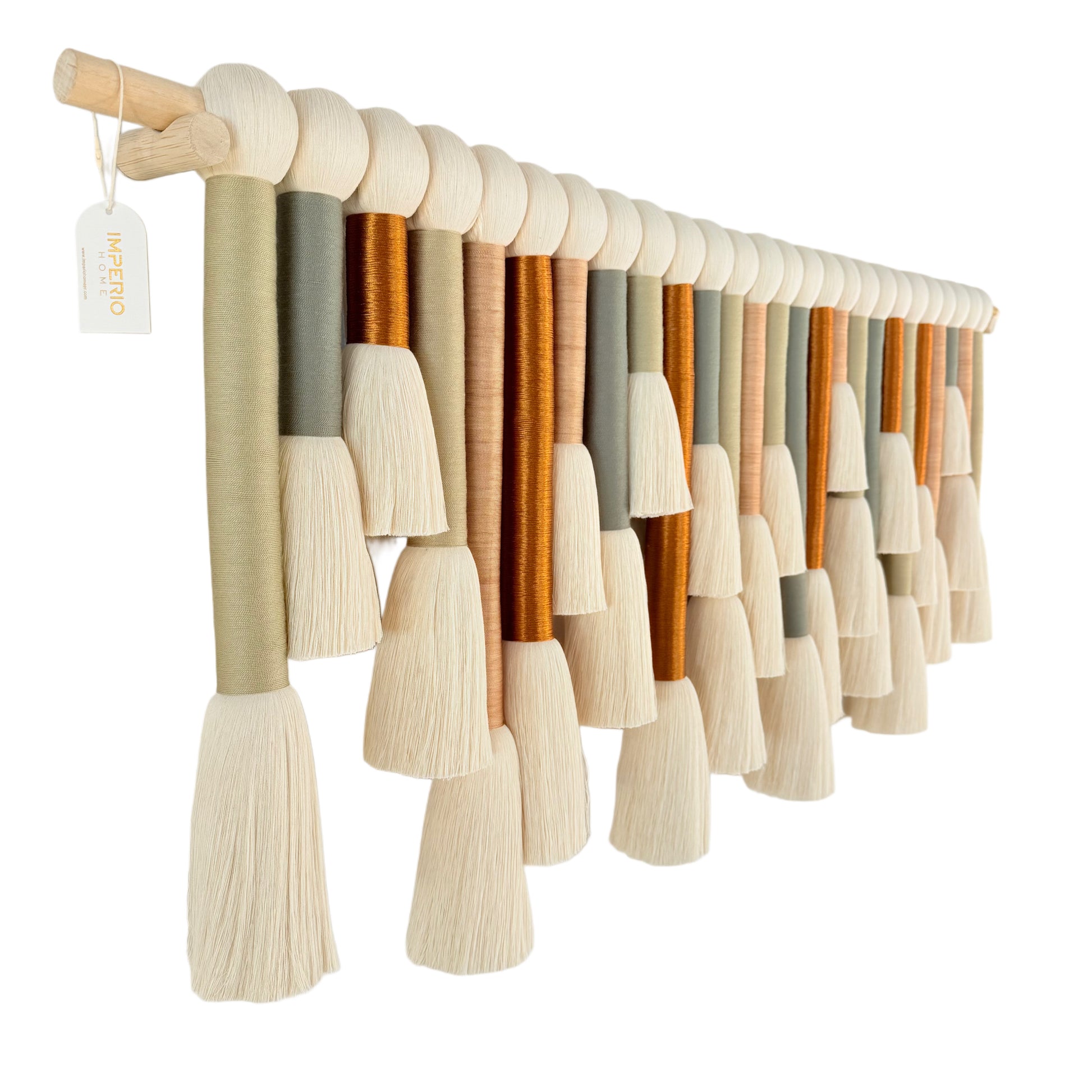 Handwoven wall tapestry made from a cotton yarn base, interlaced with synthetic colored threads that create a warm and sophisticated look. Mounted on a solid wood support for easy installation and a refined finish.
