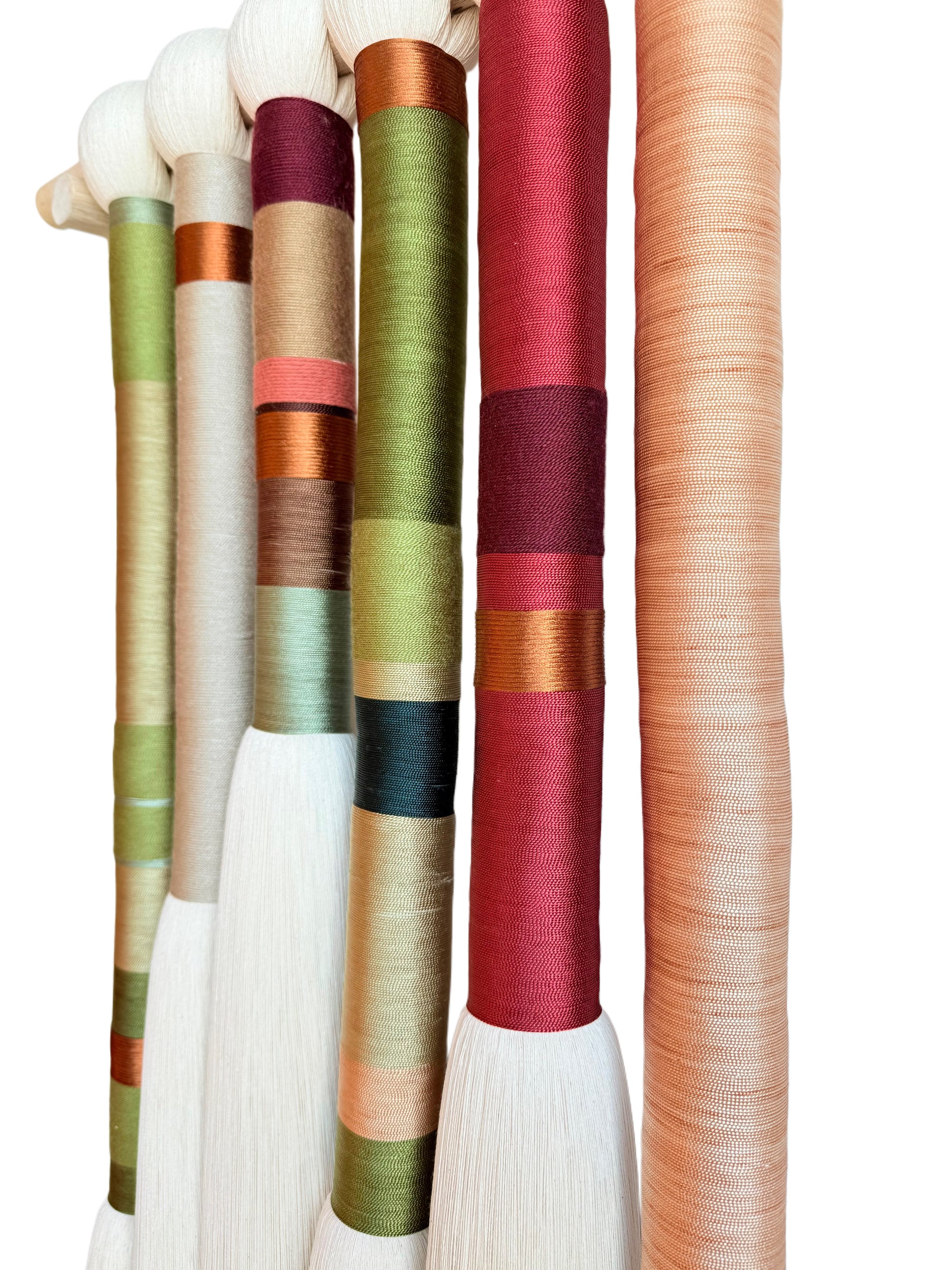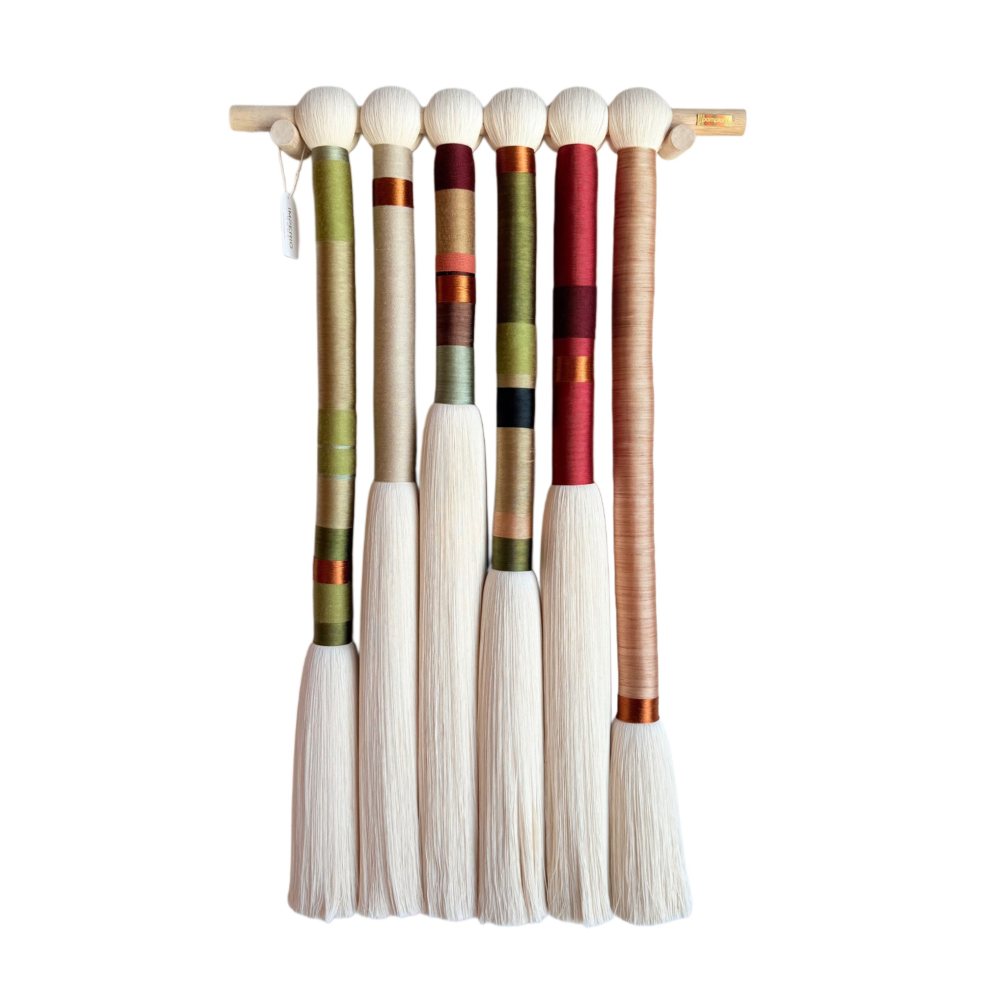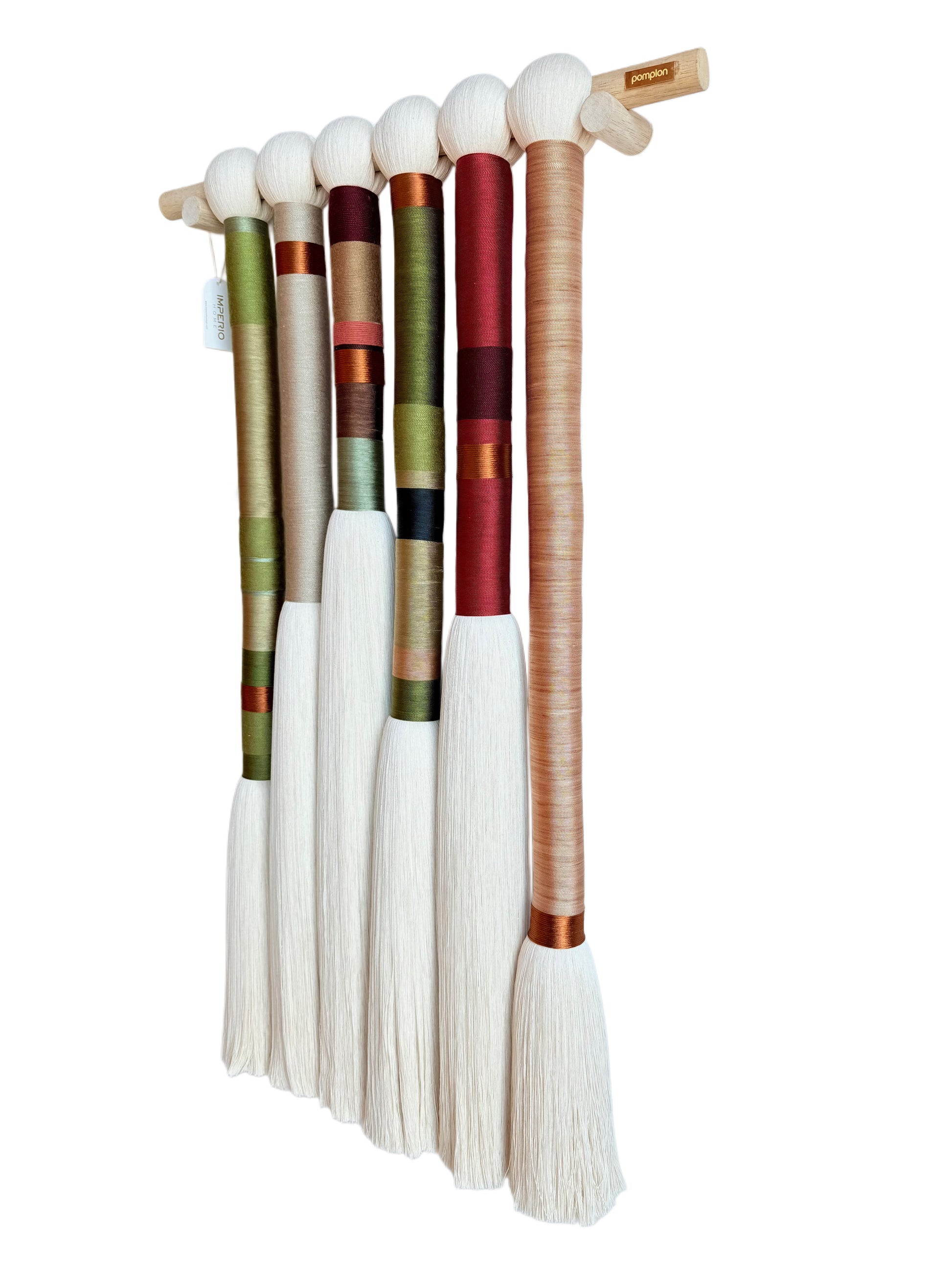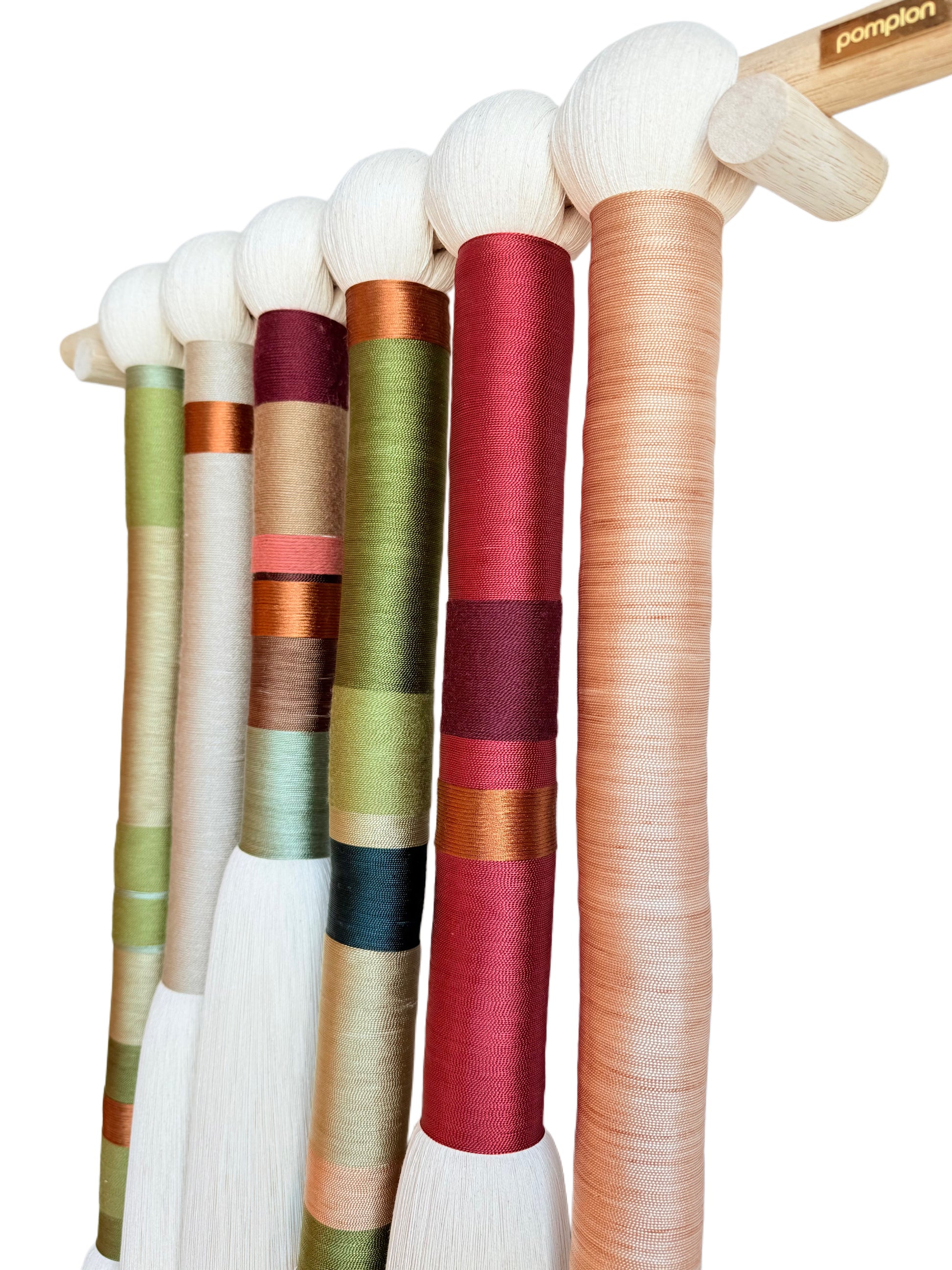 Handwoven tapestry made from a cotton yarn base, crafted with colorful synthetic threads for a unique and modern texture. Features a solid wood support for easy installation and an elegant finish.